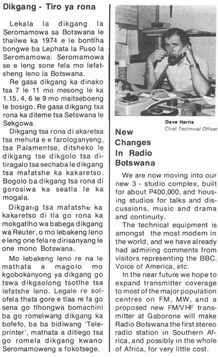 The picture on the right comes from the Radio Botswana programme guide for April 1978. Click through for the patronising text as well (the column in Setswana is all about the newsroom). Apart from the thermos flask, astute boffins will notice TWO telephones (=status!), and an old AVO valve tester on the desk. Ahhh - happy days... When Pru, Siân, Michael and I came back from Botswana in 1984 we were ten years out of date with the rest of the UK. I didn't even know about Abba so nobody would give me a job. To keep the wolf from the door I had to write articles for technical magazines for seventy-five pounds a page. I was paid an extra 2p for every word over 5 syllables but didn't manage very many. One of the articles, about the broadcasting applications of small chocolate sweets ("Smartie" - from Wireless World, December 1985) is here. |